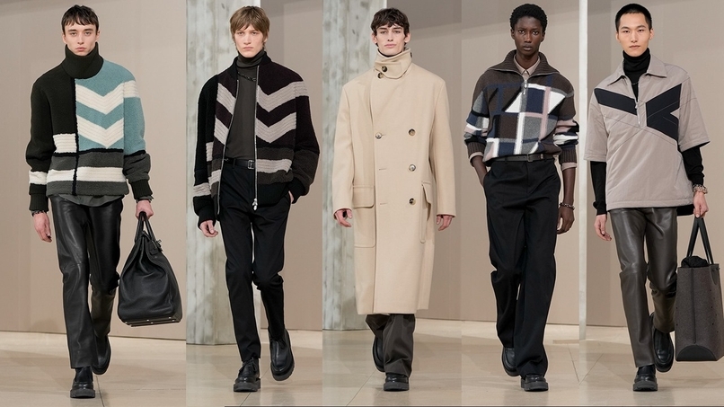 Hermès Men avoids loud or experimental color stories. Instead, it relies on a palette drawn from nature and equestrian tradition: Camel and tobacco. Olive and forest green. Navy, charcoal, and stone. Soft neutrals and warm browns. These tones allow garments to integrate seamlessly into an existing wardrobe, reinforcing Hermès’ emphasis on continuity rather than replacement. Patterns, when present, are subtle—fine stripes, textured weaves, or artisanal motifs that reward close attention. The result is clothing that feels timeless rather than tied to a specific moment.