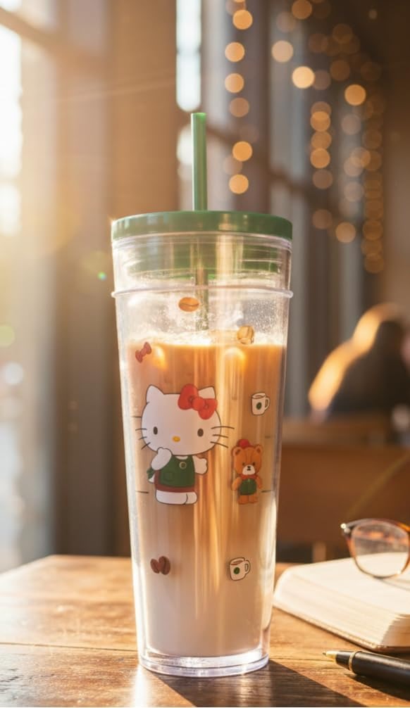 24 oz Acrylic Cold Cup with Hello Kitty Sparkle DesignCategory: Iced Drink Cup Best For: Iced coffee, frappuccinos, teens & students This clear acrylic cold cup showcases Hello Kitty in festive poses, surrounded by glittery accents and Starbucks stars. It includes a reusable straw and a tight-seal lid. Lightweight, durable, and eye-catching — this cup has become a favorite for fans who love taking seasonal cold-drink selfies. Great for iced coffee lovers. Cute, sparkly graphic design. Lightweight and travel-friendly