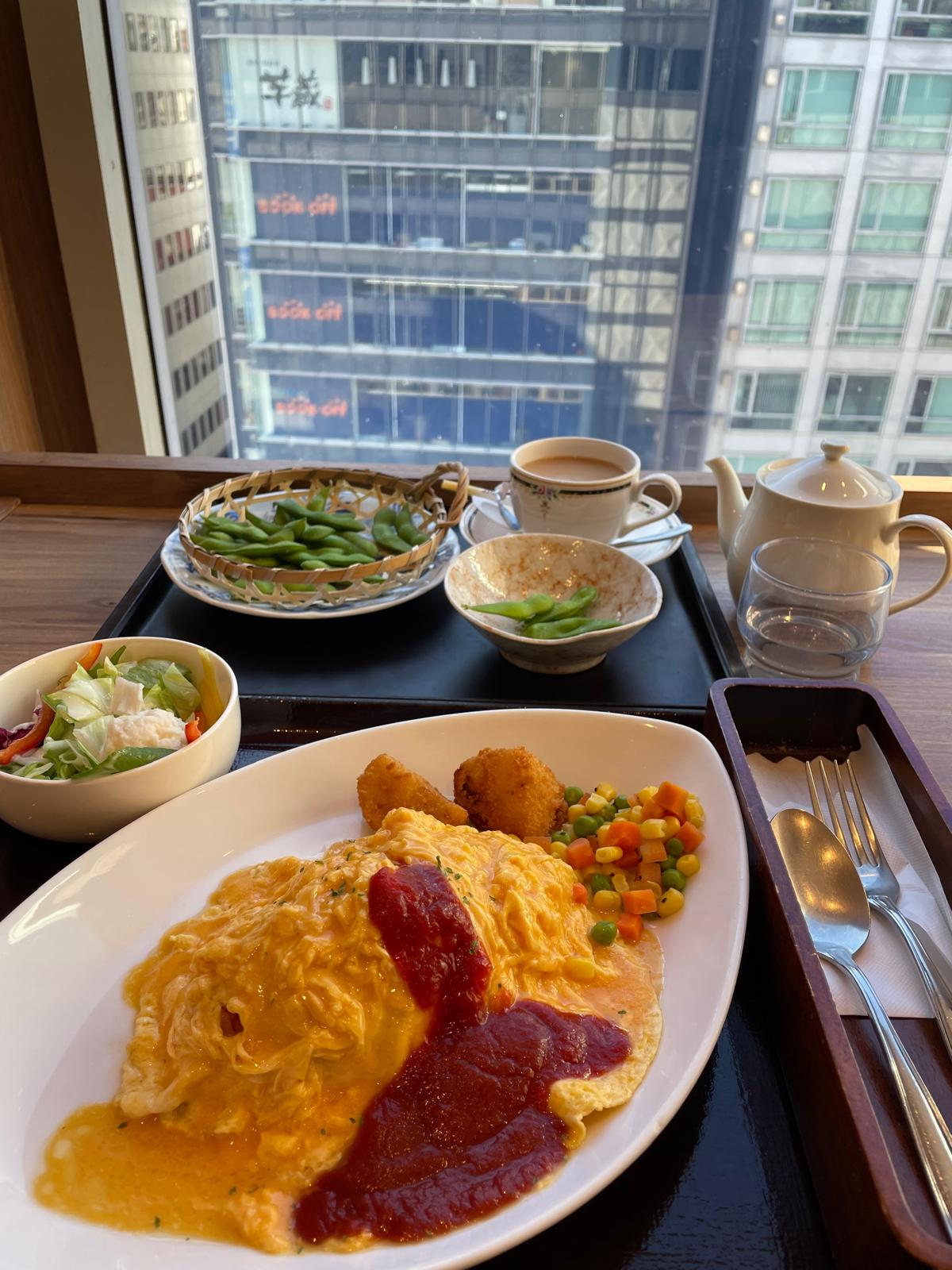 At the heart of this dining experience is a beautifully plated dish of omurice, a Japanese comfort food classic. The name \omurice\ combines \omelet\ and \rice,\ and this version is nothing short of perfection. The omelet’s golden, fluffy exterior drapes over a bed of seasoned rice, its richness balanced by a generous dollop of tangy tomato sauce. The soft texture and harmonious flavors make every bite indulgent yet comforting.