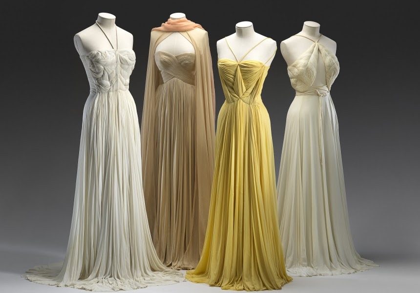Yves Saint Laurent frequently referenced neoclassical and Greco-Roman silhouettes, directly descended from the Parisian muslin dress of the Directoire and Empire eras. His 1970s collections, especially his “Greek Muse” and “Safari” looks, celebrated the unstructured flow and translucent layering typical of muslin gowns. YSL’s haute couture atelier used fine muslin prototypes to perfect every drape and pleat before constructing the final garments in chiffon or silk crêpe. The sensual freedom in Saint Laurent’s designs — often sheer, flowing, and body-conscious — directly reflected the daring confidence of the Merveilleuses who first wore muslin in post-revolutionary Paris.