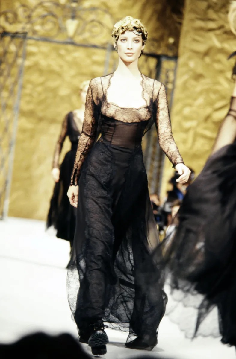 Christian Lacroix brought theatrical romanticism back to haute couture in the 1980s and 1990s, often referencing 18th-century French fashion. His collections frequently paid homage to Marie Antoinette’s chemise à la reine — the first muslin dress to cause scandal in Versailles. Lacroix transformed this historical silhouette into opulent couture pieces made of embroidered cotton muslin, organza, and tulle, decorated with lace and ribbons but maintaining the essence of airiness and femininity. His muslin-inspired gowns blended past and present — delicate yet bold, simple yet luxurious.